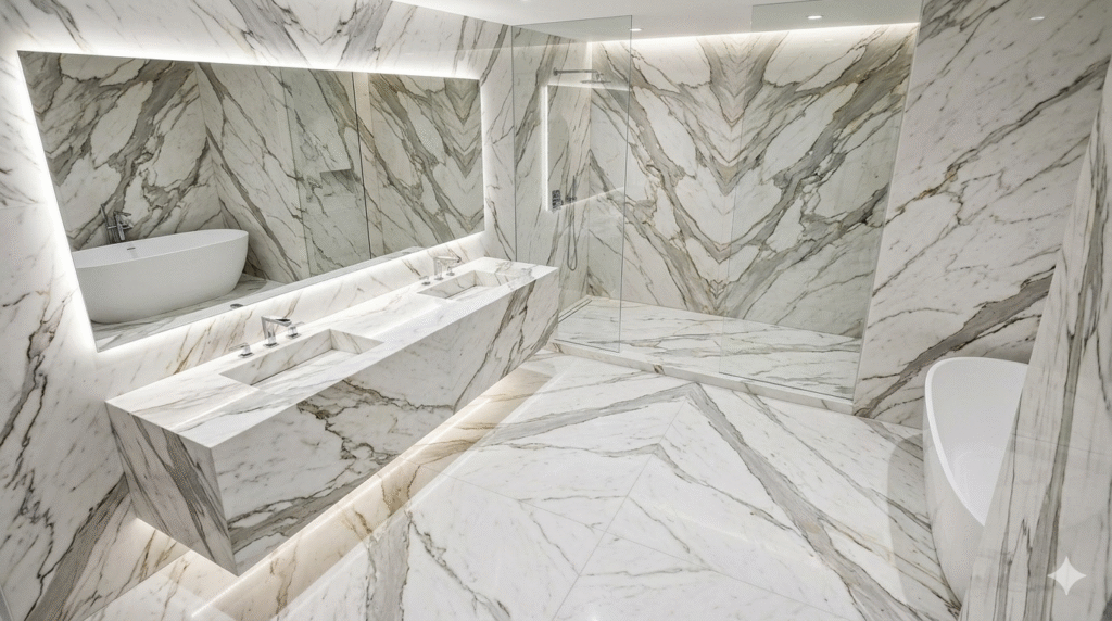 Calacatta Marble is famous for its dramatic veining and luxurious appeal.