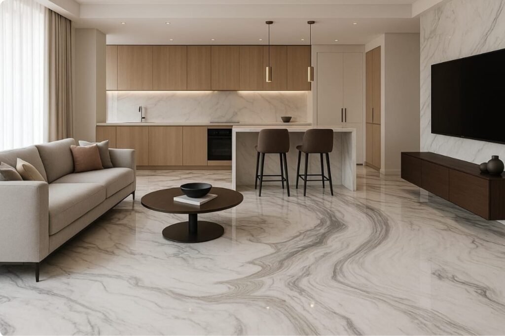 Volakas Marble suits modern and luxury interiors because its subtle veining and bright tone blend easily with contemporary furniture and lighting.